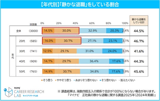 ◆正社員の4割以上が「静かな退職」をしていると回答。20代が最多で46.7%