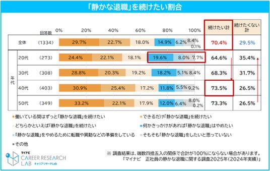 正社員の4割以上が「静かな退職※」をしており、20代が46.7%で最多。「静かな退職」をしている人の7割以上は「今後も静かな退職を続けたい」。中途採用担当者の約4割が「静かな退職」に賛成