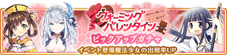 『ウォーミングバレンタイン ピックアップガチャ』では、下記ピックアップ対象の魔法少女およびメモリアの提供割合がアップしております。