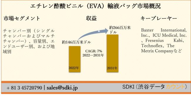 SDKI Inc.が「エチレン酢酸ビニル(EVA)輸液バッグ市場ー世界の予測2022ー2031年」の新調査レポートを2022年03月22日に発刊しました。レポートは、業界の新ビジネスチャンスとともに、市場とその成長見通しの完全な評価を提供します。さらに、2022ー2031年の予測期間中の市場規模と年間成長率が含まれています。