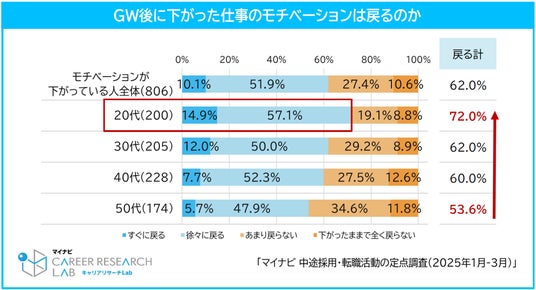 ゴールデンウィーク後に下がった仕事のモチベーションは「徐々に戻る(51.9%)」の回答が最多で、「すぐに戻る(10.1%)」と合わせて62.0%が、いずれモチベーションが戻ると回答した。年代別にみると、戻る割合が高いのは20代であり、年代が高いほどモチベーションが戻りづらい傾向がみられた。【図5】