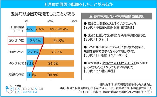 また、五月病が原因で転職したことがあるのは、転職検討中かつ転職経験者のうち19.6%、20代では35.2%で最多だった。五月病が原因で転職した人に詳しい理由を聞くと、「職場の人間関係が上手くいかなかった(20代)」など「人間関係」についての意見が多くあがった。【図7】