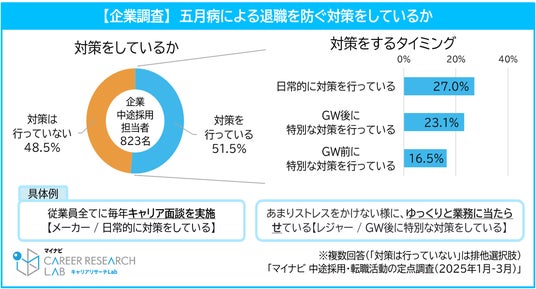 企業の中途採用担当者に、五月病による退職抑制の対策をしているか聞くと、51.5%が対策をしていると回答した。ゴールデンウィークなどの時期やタイミングを問わず、日常的に退職抑制の対策をしている企業が多かった。
