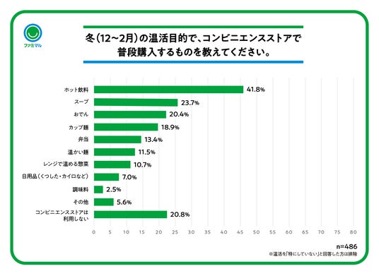 また、温活目的で購入するコンビニ商品を聞いたところ、1位「ホット飲料」41.8%、2位「スープ」23.7%、3位「おでん」20.4%となり、コンビニで購入できる手軽さも重要なポイントとなります。