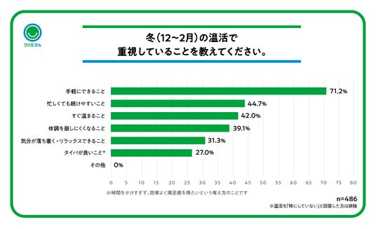 また、温活を実施するにあたり、光熱費(電気代・ガス代)を意識するかを聞いたところ、80.6%が意識すると回答し、節約しながら温活したい意向が高まっていることが分かりました。こうした結果から、専用アイテムを使ったり、暖房をつけたり、全身でお風呂に浸かるといった「特別な時間を設ける温活」が主流だったこれまでの温活から、近年は日常生活の忙しさに加え、物価高や光熱費高騰の影響も背景に、より手軽でコストを抑えながら、時間効率(タイパ)を意識した温活へとシフトしている傾向がうかがえ、特別な準備や負担を伴わず、日常生活の延長線上で無理なく取り入れられる温活に注目が集まっています。
