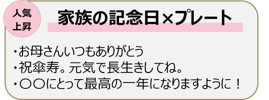 【長寿祝い、卒業・入学など特別な日に。】家族のお祝いプレート家族での記念日にレストランを利用する方々が増えています。お子様の誕生日や還暦祝い、祖父母の金婚式など、家族のお祝いごとをメッセージプレートで素敵に演出してみては?