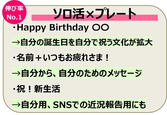 スターツ出版株式会社(本社:東京都中央区、代表取締役社長:関根赴治)が運営する「OZmall(オズモール)」(会員数500万人)では、2019年~2025年の『メッセージプレート付きプラン』の利用動向を分析しました。『メッセージプレート』利用数は7年で約1.7倍に増加し、20~40代の女性を中心に年間約22万人が体験しています(2025年時点)。昨今利用が伸びているシーンは家族の記念日や女子会・友達との食事会ですが、特に顕著な変化は、『ひとり×メッセージプレート』の予約で、7年で約35倍に増加。「誕生日に自分のためのメッセージプレートを用意」「推しの記念日」「自分への励まし」など、明確な意図をもって利用されていることがわかりました。こうした変遷から、かつては誕生日や記念日の「特別な演出」だったプレートは、“自分のために演出するもの”へ進化しています。
