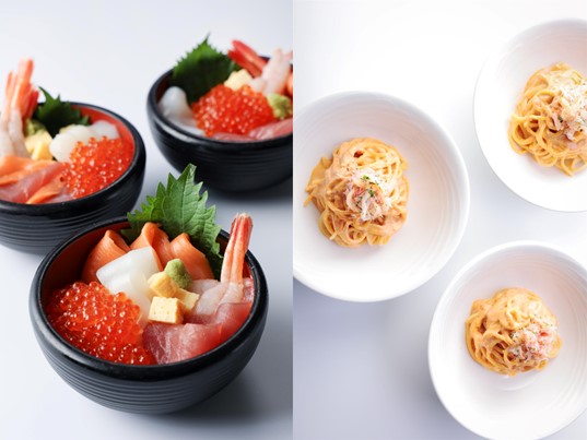 低温で時間をかけてじっくりジューシーに焼き上げるホテル伝統のローストビーフや天麩羅、ご注文をいただいてから作る出来立てのウニクリームパスタに加え、いくらやマグロなど、お好みの海鮮がのせ放題のオリジナル海鮮丼に、揚げたてソースかつ丼・天丼など、ライブ感あふれるシェフのクッキングサービスで出来立てを提供するほか、ニューオータニ自慢のメニューの数々をご用意いたします。