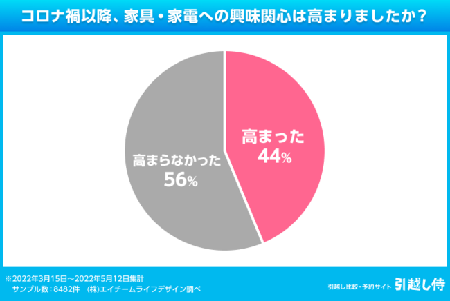新型コロナウイルス感染症の感染が広まって以降、「家具・家電に関する興味・関心が高まった」と答えた人は、44%でした。