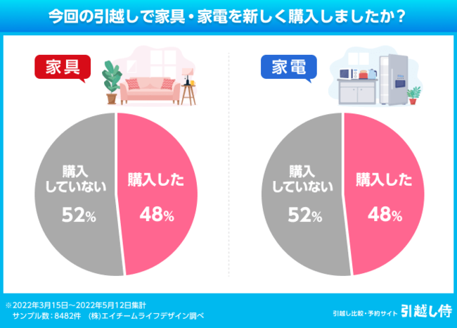 家具も家電も、「今回の引越しで新しく購入した」という人は48%、「購入していない」人は52%と、ほぼ半々となりました。