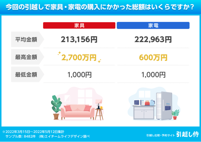 今回の引越しの家具や家電の購入総額の平均は、どちらもそれぞれ約20万円程度。100万円を超えた人は3%以上おり、最高額は家具で2,700万円、家電で600万円だった。