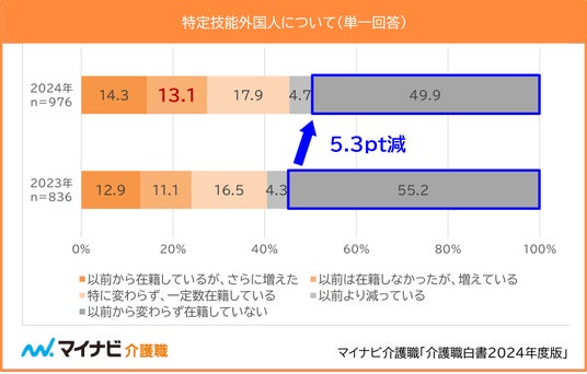 深刻な人手不足に対応するために2019年4月1日より介護分野においても在留資格「特定技能」が導入されている。職場での特定技能外国人の介護職員の増減について聞いたところ、「以前から変わらず在籍していない(49.9%)」は半数以下となり、前年(55.2%)より5.3pt減少した。「以前は在籍しなかったが、増えている(13.1%)」が前年比の伸び率が最も高いことから、新たに特定技能外国人を雇用する職場が増えていると考えられる。2025年4月にはこれまで認められていなかった訪問介護においても、一定の条件のもと、外国人介護人材の従事が認められ、特定技能外国人が働ける環境の拡大に伴い、受け入れについても増えていく可能性がある。【図5】