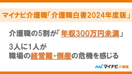 介護職の5割が「年収300万円未満」。「処遇改善の対応があった」は6割で、前年比8.1pt増。3人に1人が職場の経営難・倒産の危機を感じる