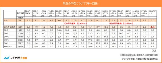 現在の年収を聞いたところ、52.4%が年収300万円未満だった。国税庁によると給与所得者の平均給与は460万円とされているが※1、介護職では92.6%が年収450万円未満であった。また正社員・正職員の平均給与は530万円とされているが※1、介護職では年収「500万円以上」は4.4%だった。【図1】