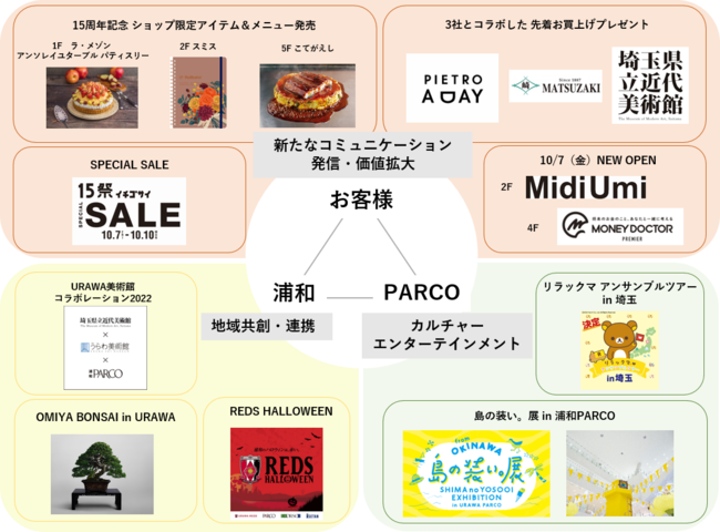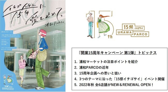 2007年オープンの浦和PARCOは、開業15周年を迎えます。昨秋には埼玉・浦和に増加するミレニアル世代の夫婦・ファミリー層に向けて“都市型消費”を叶える開業来最大のリニューアルを実施致しました。今秋は、10月7日(金)より「15年分のイチゴイチエに愛を込めて」をテーマに、開業15周年キャンペーン第1弾「15祭イチゴサイ」を開催致します。全館セールやショップ限定アイテムに加え「地域共創・連携」「カルチャー発信」を軸に、かねてより浦和PARCOにご来店いただいているお客様から、近年浦和への暮らしをスタートした20~30代のミレニアル世代まで、幅広い世代のお客様3世代が楽しめるイベントをお届け致します。また、関東初出店を含む全6店舗がNEW&RENEWALオープンし、街のニーズに添ったファッション・サービス等のMDバラエティを拡充致しました。15年間皆さまに支えられ、浦和PARCOは幅広いお客様に楽しんでいただけるビルへと成長いたしました。これまでの感謝をお伝えするとともに、これからも一期一会を大切に、浦和の街を盛り上げて楽しい時を一緒に過ごせるよう努めてまいります。