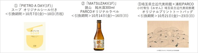 期間中、浦和PARCOにてPARCOカードまたはポケパル払いにて一定金額以上、お買上げいただいたお客さま合計1,500名様に15周年を記念したオリジナルグッズを週替わりでプレゼント。