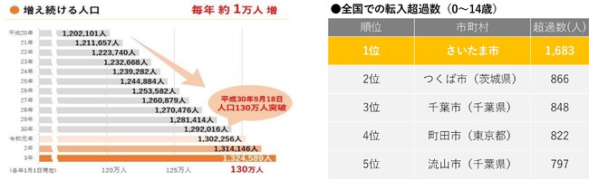 浦和区を含むさいたま市は、毎年約1万人増加しており、人口増加数・転入超過数ともに全国トップにランクインしております。特に、子育て・教育環境の充実から、0歳から14歳の転入超過数では、7年連続で全国第1位となっており、子育て世代に選ばれております。