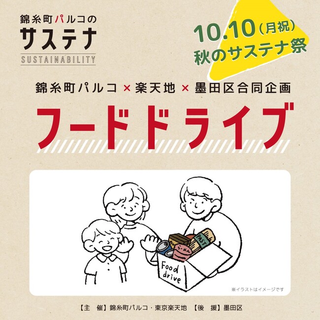 「秋のサステナ祭」では、1.フードドライブ:墨田区 2.リサイクル:東京楽天地、錦糸町パルコ 3.ワークショップ:無印良品 4.地産地消、すみだの銘店:錦糸町パルコ の4つのテーマを掲げ、SDGsの目標である「住み続けられるまちづくりを」「つくる責任つかう責任」について取り組みます。