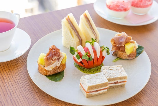 チョコレートと綿飴で作る満開の桜が中央に咲くスイーツプレートには、イタリアの伝統的なティラミスや、日本の食材をアレンジした柚子と抹茶のトルタなど、イタリアと日本の食をアレンジしたクリエイティブなメニューが並びます。セイボリープレートは、エクセルシオールホテル・ガリアでエグゼクティブシェフを務めるレバノ兄弟のレシピで作るハムとピーナッツバターのサンドウィッチや生ハムとメロンのバゲットなどをご用意。グラススイーツでは桜とストロベリーのパンナコッタをお楽しみいただけます。