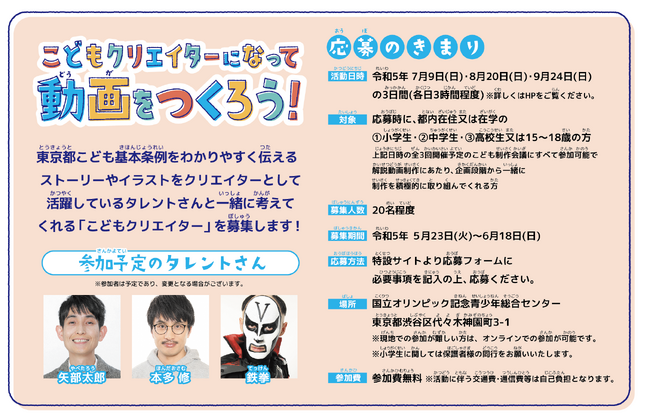 内 容:3回のこども制作会議に参加し、クリエイターとしてタレントと共に本条例をわかりやすく伝えるストーリーやイラストを考え、動画を制作します。