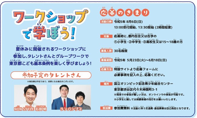 内容 :夏休みに開催されるワークショップに参加し、タレントとグループワークで本条例を楽しく学びます。