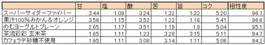 味覚センサーAIによる分析結果をもとに、「濃厚デミソースとふわっとたまごのとろとろオムライス」と一緒に楽しむことで、オムライスの味わいをよりバランスよく楽しめる、当社で販売中の飲料とのおすすめの組み合わせを検証しました。今回は、「みかん&オレンジ」「玄米茶」「のむヨーグルト プレーン」「スーパーサイダーファイバー」「カフェラテ砂糖不使用」の全く味わいの異なる5商品を対象に分析を実施しました。いずれも相性スコア90点以上と高い数値を示し、オムライスとの相性の良さが数値として確認されています。