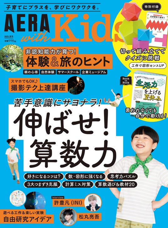 小学生や未就学児のママ・パパに子育て情報を届ける「AERA with Kids 2025夏号」(朝日新聞出版)が6月5日(木)、発売されました。巻頭特集は「伸ばせ!算数力」。算数が好きになる、得意になるアイデアを盛りだくさんで紹介しています。さらに、図形センスがUPする特別付録「正多面体で遊ぼう」も。このほか非認知能力が育つ体験&旅、自由研究なども特集しています。インタビューには、INIの許豊凡さん、松丸亮吾さんが登場しています。