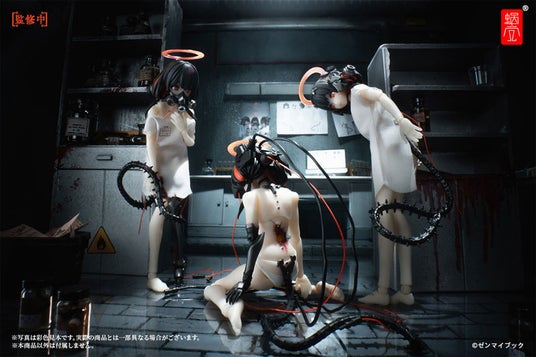 ・3キャラともに本体に布製の服を着用しています。ウェザリング・血痕・タグなどのディテールはすべてプリントで細かく再現されています。