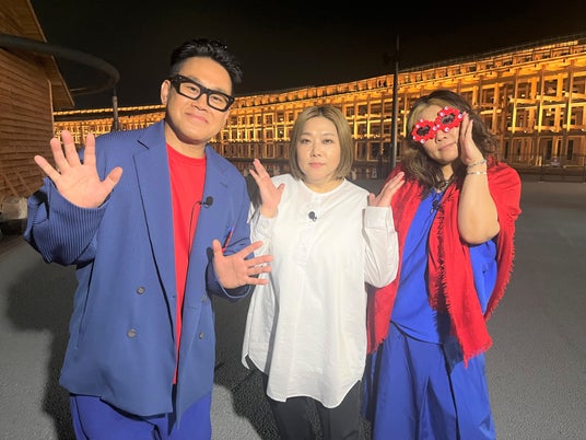 4月の開会式に流れた映像に登場したやすとも。前回、大輔が出演したロケでその話になり、まだ全員万博を訪れていなかったため、「ぜひ3人で万博に行きたい!」と話したことが1か月後に実現しました。大輔&ともこは万博カラーの服装で気合い十分!