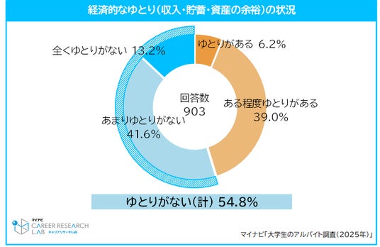 ◆アルバイトをしている大学生の「経済的なゆとりがない」割合は54.8%で、調査開始以来最高