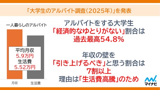 「経済的なゆとりがない」割合は過去最高54.8%。一人暮らしのアルバイト平均月収は5.9万円で生活費は月平均5.52万円。年収の壁を「引き上げるべき」と思う割合は7割以上。理由は「生活費高騰」のため