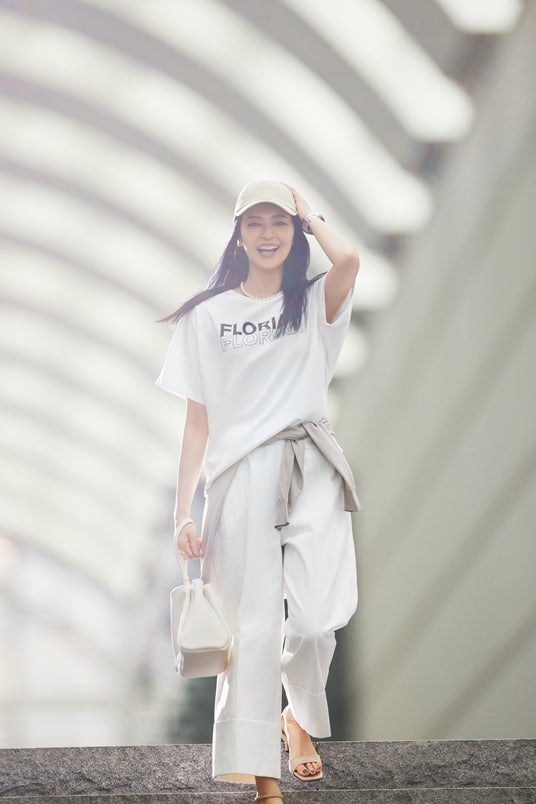 ブランドデビュー以来ロングセラーとなっている「サマ見えTシャツ」を活用した、オールホワイトコーディネート。大人女性にとってカジュアルになりすぎてしまう夏のTシャツコーデですが、Eluraのサマ見えTシャツなら大丈夫。上品見えするハリ感のある素材は身体のラインも拾いにくく、大人女性のために考え抜かれたシルエットも秀逸。さらに、汗じみ軽減加工・UVカット機能等、夏にうれしい機能も満載。何枚でも持っておきたい名品Tシャツです。