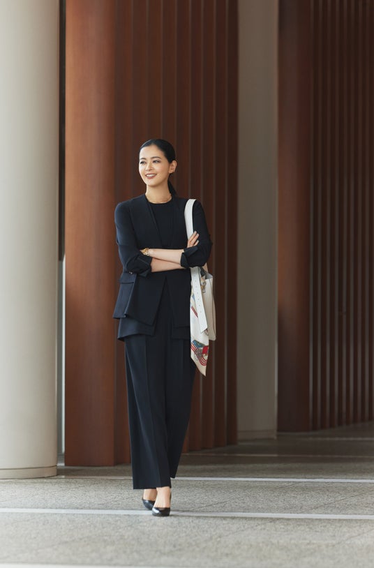 シックなワントーンで品格UP。端正な美しさと軽さのある素材感の「夏ラクシリーズ」を全身に使ったオフィススタイルです。