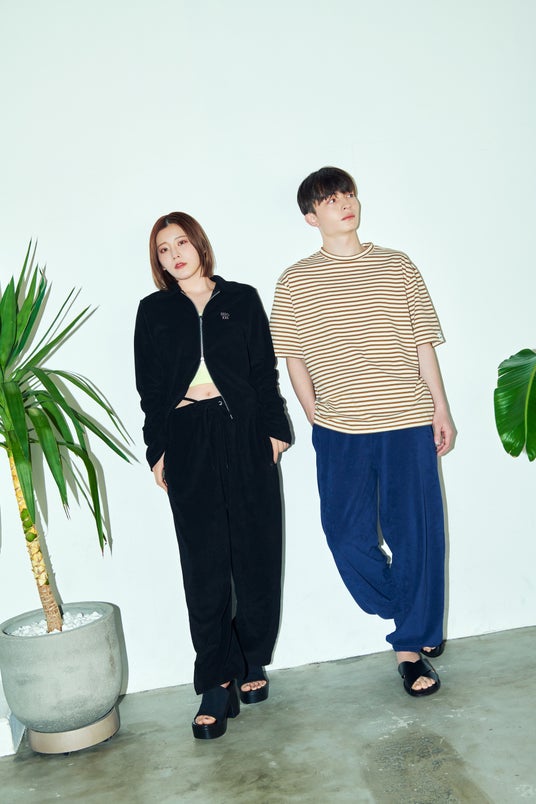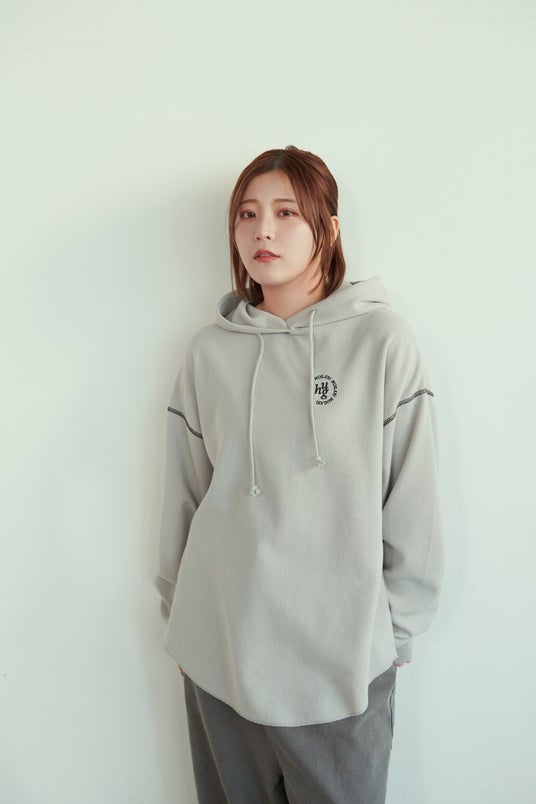 男女問わずいろんな方に着てもらいたくて、パーカーやTシャツはオーバーサイズを意識しました。お家でもラフ着られるようにTシャツは着心地のいいコットン生地、パーカーはワッフル素材、セットアップはパイル生地を選びました。ぜひパートナーやお友達とペアルックで着ていただきたいです!