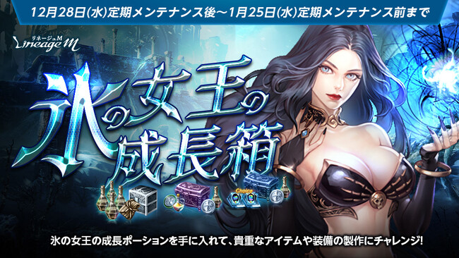 使用すると2,000万経験値を獲得し、一定時間経験値ボーナス+50%など複数のバフ効果の付与や、各種製作の材料としても使用することのできる「氷の女王の成長ポーション」が獲得できる「氷の女王の成長箱」の期間限定製作2週目が登場しました。