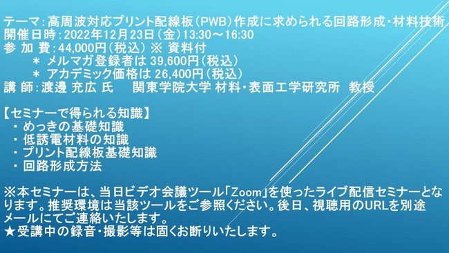先端技術情報や市場情報を提供している(株)シーエムシー・リサーチ(千代田区神田錦町: https://cmcre.com/ )では、 各種材料・化学品などの市場動向・技術動向のセミナーや書籍発行を行っておりますが、 このたび「高周波対応プリント配線板(PWB)作成に求められる回路形成・材料技術」と題するセミナーを、 講師に渡邊 充広 氏 関東学院大学 材料・表面工学研究所 教授)をお迎えし、2022年12月23日(金)13:30より、 ZOOMを利用したライブ配信で開催いたします。 受講料は、 一般:44,000円(税込)、 弊社メルマガ会員:39,600円(税込)、 アカデミック価格は26,400円(税込)となっております(資料付)。