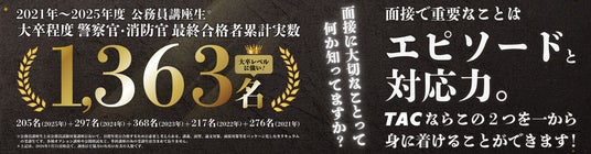 警察・消防をはじめとした公安職の試験は勉強ができるだけでは受かりません。勉強はもちろん人物試験対策がとても大切です。TACでは警察消防試験専用の担任が在籍し、皆様の筆記試験対策や人物試験対策のお手伝いをします。TACのシステムをうまく活用して一緒に合格を目指しましょう!