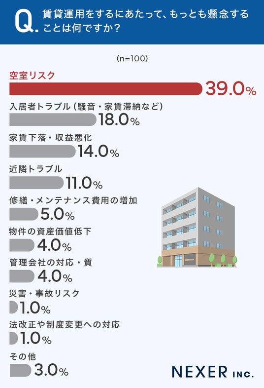 今回の調査では、賃貸運用で最も不安に感じられているのは「空室リスク」で、約4割にのぼることがわかりました。