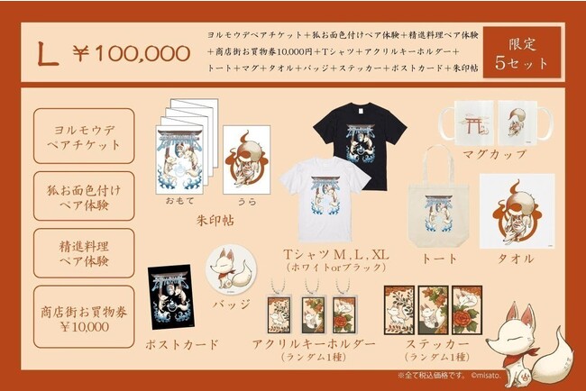 ■L<限定5口> 狐お面ペア体験、精進料理ペア、ヨルモウデペアチケット、お買物券1万円分、雑貨セット 100,000円