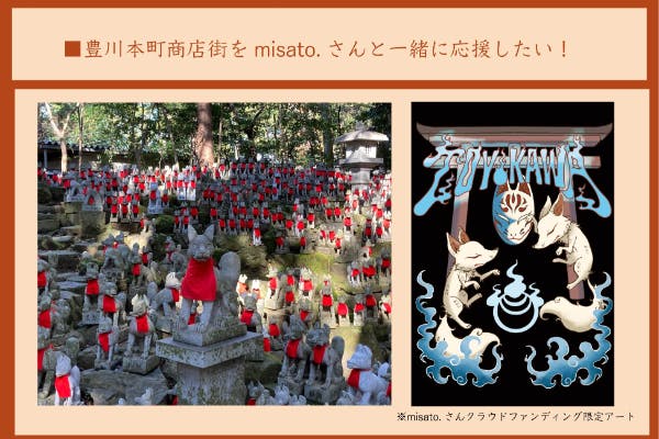 今回は日本三大稲荷の一つ「豊川稲荷」の門前町、「豊川本町商店街」の素晴らしさをもっと多くの人に知ってほしい。この思いを実現するため、大人気クリエイターmisato.さんと豊川本町商店街とのオリジナルグッズを制作します。コロナ禍でも豊川本町商店街の名を広め魅力を発信するためのプロジェクトを立ちあげました。