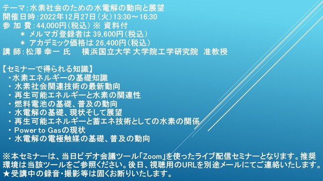 先端技術情報や市場情報を提供している(株)シーエムシー・リサーチ(千代田区神田錦町: https://cmcre.com/ )では、 各種材料・化学品などの市場動向・技術動向のセミナーや書籍発行を行っておりますが、 このたび「水素社会のための水電解の動向と展望」と題するセミナーを、 講師に松澤 幸一 氏 横浜国立大学 大学院工学研究院 准教授)をお迎えし、2022年12月27日(火)13:30より、 ZOOMを利用したライブ配信で開催いたします。 受講料は、 一般:44,000円(税込)、 弊社メルマガ会員:39,600円(税込)、 アカデミック価格は26,400円(税込)となっております(資料付)。