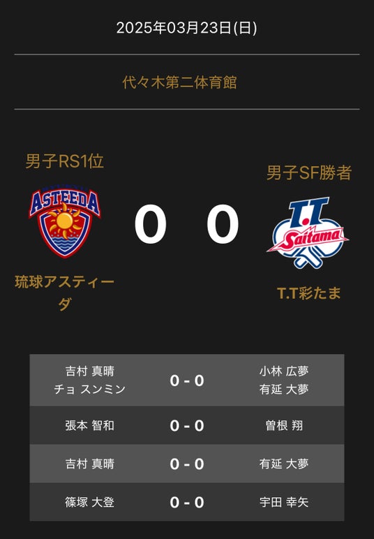 ノジマTリーグ 2024-2025シーズン 公式戦 3月23日開催 男子ファイナル 琉球アスティーダ vs T.T彩たまの対戦オーダーを発表いたします。
