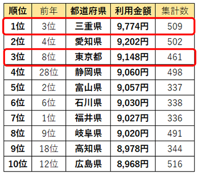 美容室の年間利用金額1位は、2年連続「東京都」の3万8,947円、2位「三重県」3万8,073円、3位「大阪府」3万4,625円