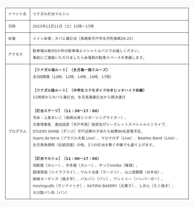 2023年11月11日(土)11:00~17:00 【メイン会場】平戸市生月町 大バエ鼻灯台