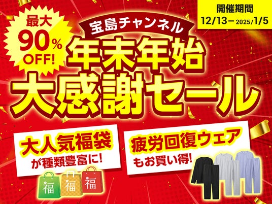 ファッション雑誌販売部数トップシェア(※)の株式会社宝島社(本社:東京都千代田区、代表取締役社長:関川誠)の公式通販サイト「宝島チャンネル」は、2024年12月13日(金)正午から2025年1月5日(日)まで年末年始大感謝セールを開催します。期間中は毎年SNSでも話題となる人気商品の福袋(1980~9800円)や、美容機器や推し活に使える便利なバッグなどの最大90%オフセールを実施します。