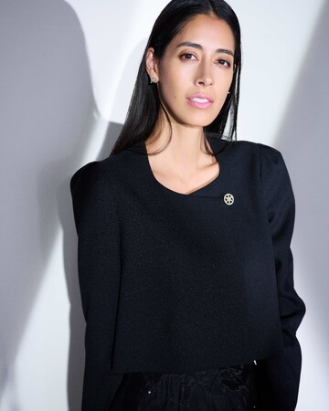 凛としたオーラを放つオールブラックの装いに真っ白な襟でメリハリを効かせて。