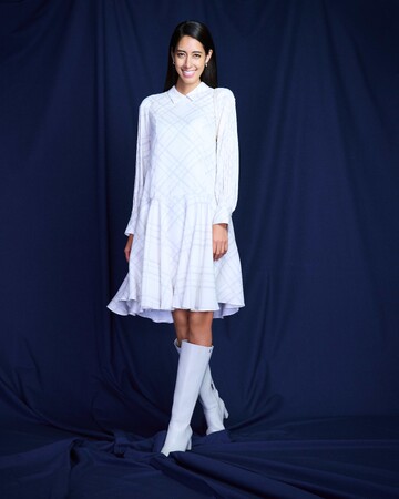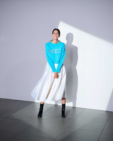 「今季のアイテムで特に印象に残ったのは、パッと目に飛び込んでくるブルーのワンピースやニット。