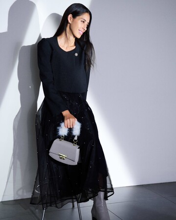 上下ブラックで揃えたスタイリングは、ツイード風ジャケットとほのかに透けるボトムで素材感に緩急をつけて。スカートに散りばめた小粒パール、バッグのハンドルにあしらったファーでさらに奥行きを出しました。