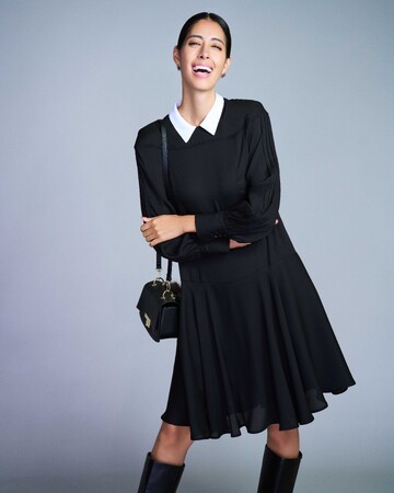 オールブラックに映える白い襟コントラストが知的な美しさを演出