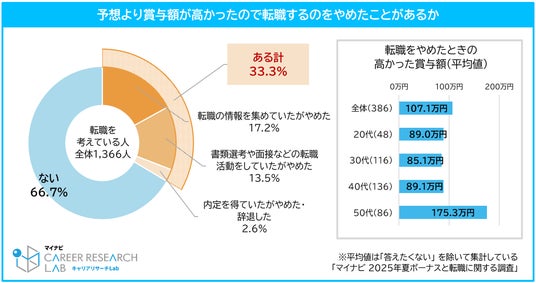 実際に「想定よりも賞与額が高かったことで転職を思いとどまった経験がある」人の割合は全体の33.3%だった。 転職中止を決めた際の賞与額は平均107.1万円で、賞与の金額が転職の意思決定に一定の影響を及ぼしていると考えられる。【図2】